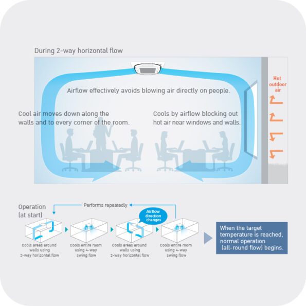 สลับการกระจายลมแบบ 2 ทิศทางเพื่อส่งลมไกล และรอบทิศทางเพื่อกระจายลมทั่วถึง ปรับลดอุณหภูมิห้องให้ห้องเย็นเร็วอย่างทั่วถึง ไม่รู้สึกหนาวเกินไป แม้อยู่ใกล้เครื่องปรับอากาศ