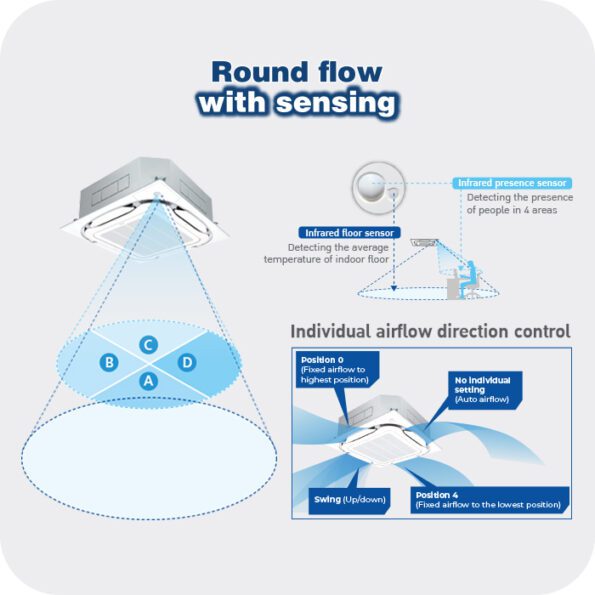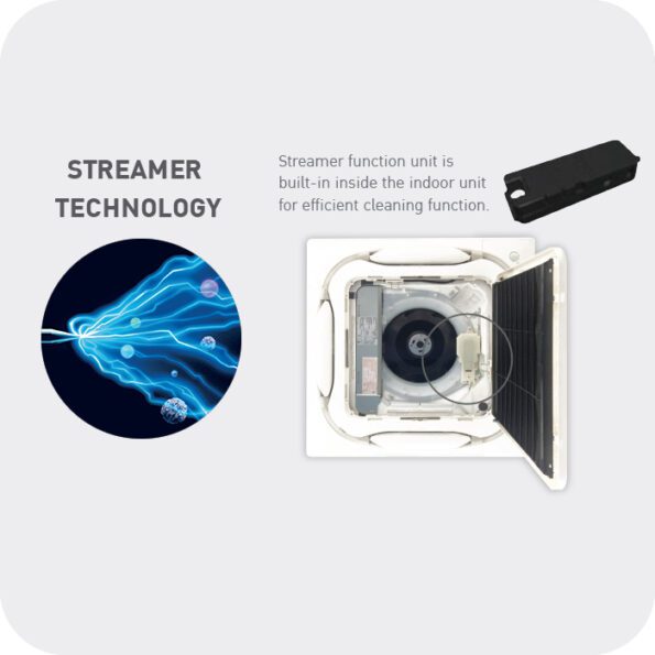 แอร์แบบฝังในฝ้ากระจายลมรอบทิศทาง (Round Flow Cassette) พร้อมเซ็นเซอร์ตรวจจับ และฟังก์ชั่นสลายเชื้อโรค ฝุ่น และสสารอันตรายบนแผ่นกรองด้วยเทคโนโลยี Streamer กระจายลมอย่างทั่วถึง 360 องศา สามารถเลือกรูปแบบการปล่อยอากาศได้หลากหลายจึงสามารถปรับเข้ากับพื้นที่ติดตั้งได้ทุกพื้นที่ มีแผ่นกรองอากาศและถาดรองน้ำทิ้งเคลือบสารยับยั้งแบคทีเรียเพื่อสุขภาพที่ดี