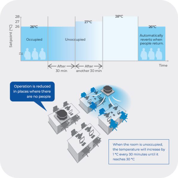 เซ็นเซอร์คู่ จะทำงานร่วมกับการควบคุมบานสวิงอย่างอิสระในแต่ละด้าน เพื่อให้ความเย็นสบายที่เหมาะสมในแต่ละด้านของห้อง