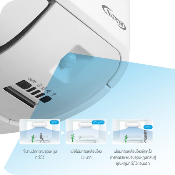 รองรับความต้องการที่หลากหลายให้อากาศเย็นสบาย และประหยัดพลังงาน ด้วยเซนเซอร์ตรวจจับการเคลื่อนไหวของคนภายในห้อง ที่มาพร้อม 2 ฟังก์ชัน ฟังก์ชันเพื่อความสบาย ตรวจจับบุคคลพร้อมปรับทิศทางลมได้2 รูปแบบ กระจายลมไปสู่คนโดยตรง หรือเลี่ยงการกระจายลมไปสู่คน(