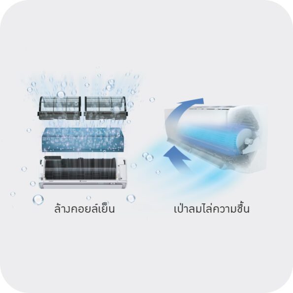ระบบทำความสะอาดตัวเองด้วยการล้าง Heat Exchanger โดยใช้การควบแน่นไอน้ำในอากาศในกลายเป็นหยดน้ำ ล้างทำความสะอาด Heat exchange จากนั้นเป่าไล่ความชื้นด้วยลม ลดการสะสมของแบคทีเรีย และเชื้อราซึ่งก่อให้เกิดกลิ่นอับ