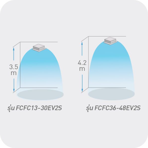 สามารถปรับการตั้งค่าการส่งลมให้เหมาะกับบริเวณที่มีเพดานสูงได้สูงสุดถึง 4.2 เมตร ทำให้ติดตั้งได้ในหลากหลายพื้นที่(Premium รุ่น 30,000-48,000 BTU,Standard รุ่น 36,000-48,000 BTU)