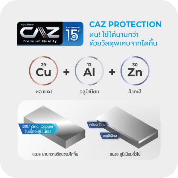 แผงระบายความร้อนเทคโนโลยีใหม่ล่าสุดจากไดกิ้น ทำจากวัสดุพิเศษที่ผสม ทองแดง (Cu) อะลูมิเนียม (Alu) และสังกะสี(Zn) ลงในเนื้อวัสดุ เพื่อเพิ่มความทนทาน ยับยั้งการกัดกร่อนได้มากกว่าแผงอะลูมิเนียมทั่วไป การันตีความทนด้วยผลการทดสอบการกัดกร่อนโดยสเปรย์น้ำเกลือเข้มข้นมากกว่าน้ำทะเลถึง 5 เท่า โดยศูนย์เทคโนโลยีโลหะและวัสดุแห่งชาติ(MTEC)