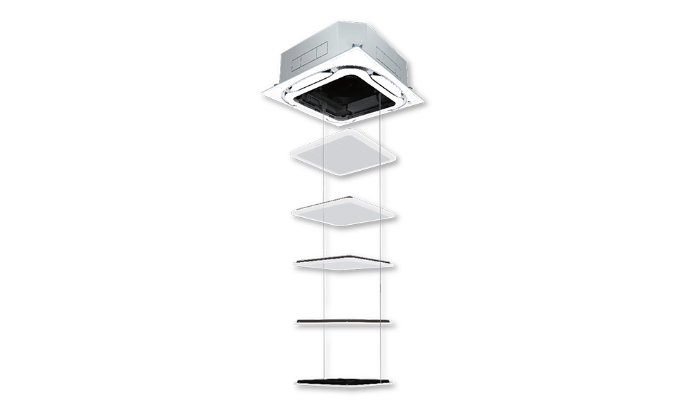 เครื่องปรับอากาศแบบฝังในฝ้ากระจายลมรอบทิศทาง (Round Flow Cassette) ประหยัดไฟเบอร์ 5 กระจายลมอย่างทั่วถึง 360 องศา สามารถเลือกรูปแบบการปล่อยอากาศได้หลากหลายจึงสามารถปรับเข้ากับพื้นที่ติดตั้งได้ทุกพื้นที่ ประหยัดพลังงานด้วยระบบอินเวอร์เตอร์แบบสวิงที่ให้ความเย็นเร็วและคงที่ ลดการตัดของคอมเพรสเซอร์ ใช้สารทำความเย็น R32 ไม่ทำลายชั้นบรรยากาศโอโซน ส่งผลให้เย็นเร็วและประหยัดพลังงาน ทำงานเงียบเพียง 27.5 เดซิเบล มีแผ่นกรองอากาศและถาดรองน้ำทิ้งเคลือบสารยับยั้งแบคทีเรียเพื่อสุขภาพที่ดี