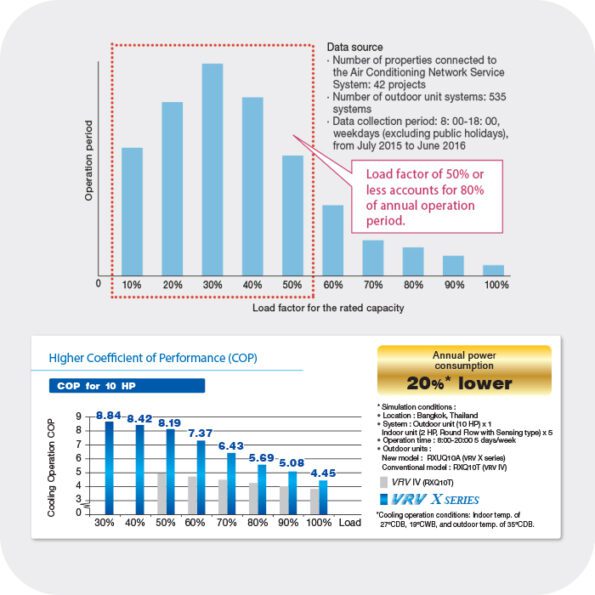 VRV X ซีรีส์เน้นการประหยัดพลังงาน ด้วยการออกแบบ Compressor ที่มีประสิทธิภาพสูงทำให้ประสิทธิภาพการทำงานของตัวเครื่องสูงมากกว่าเดิม ช่วยประหยัดพลังงานมากขึ้น นอกจากนี้ยังมีความสะดวกสบายติดตั้งง่ายและมีความน่าเชื่อถือสูงเพื่อตอบสนองความต้องการในอาคารต่างๆ